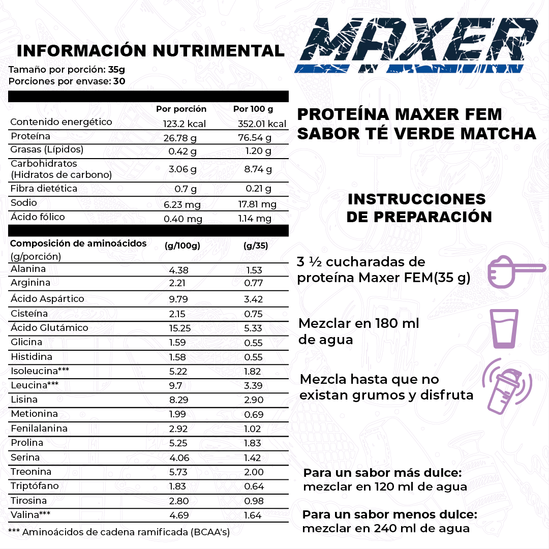 Ideal para personas que buscan una fuente de proteína de calidad y lograr perder peso de manera saludable sin sacrificar el sabor. Maxer FEM es tu mejor compañero, ya sea que busques aumentar masa muscular, perder grasa o simplemente llevar una dieta saludable cumpliendo con tu ingesta proteica.